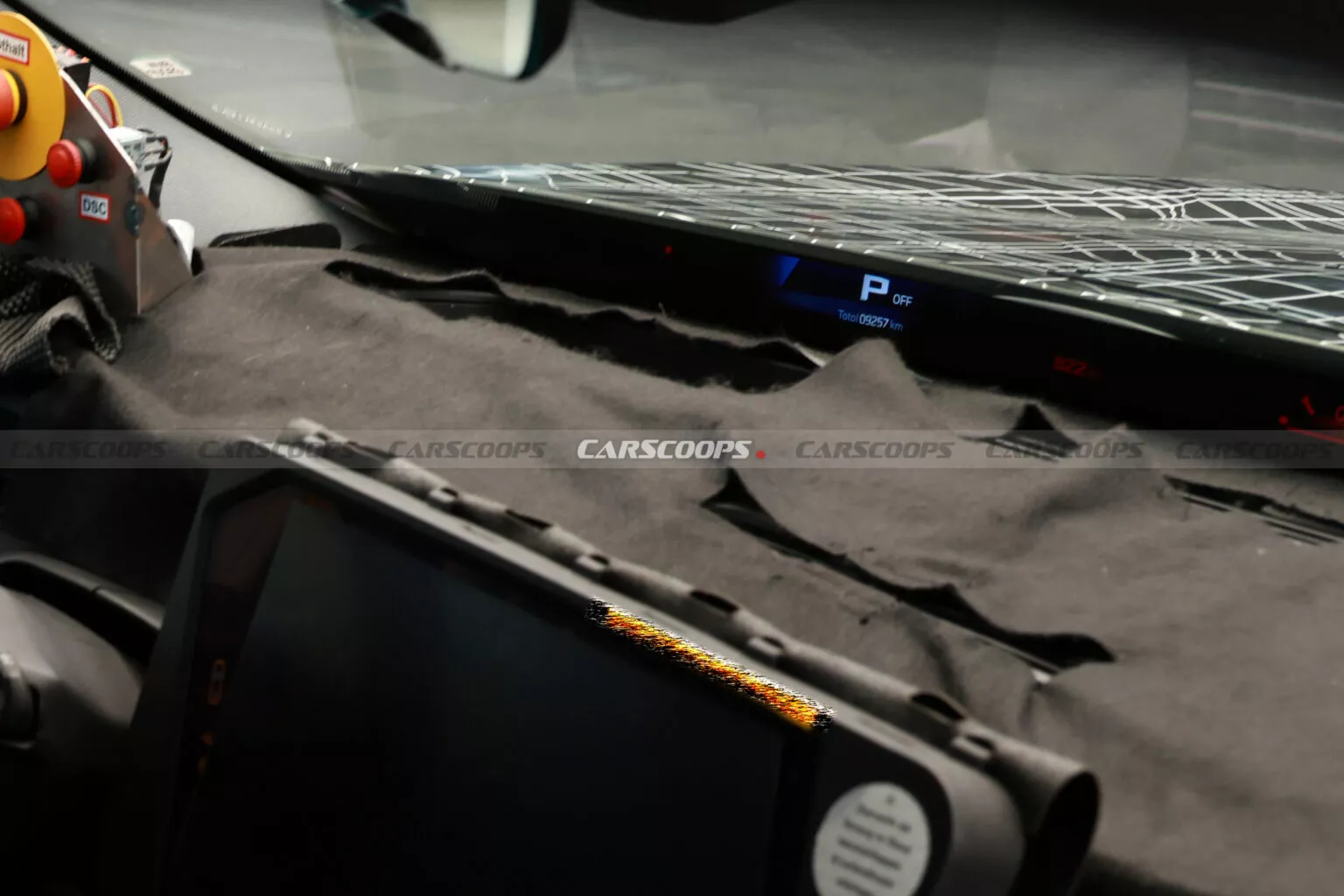 포착된 실내 사진에서 가장 주목할 부분은 운전석 앞 전면 유리창 하단을 따라 좌우로 길게 뻗은 파노라믹 아이드라이브 디스플레이다. 전통적인 계기판 자리를 완전히 대체한 이 혁신적 인터페이스는 BMW가 CES 2024에서 처음 선보인 차세대 디지털 시스템의 실물 적용 사례다. 검은색 홀로그램 형태의 디스플레이 필름이 적용되어 있으며, 기어 위치와 주행 거리를 비롯한 핵심 주행 정보가 표시된다.
